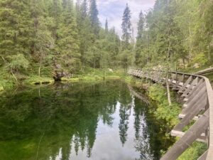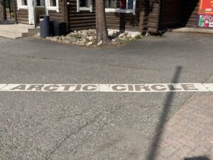 Of course I had! We actually spent our first day walking in the Arctic Circle hiking area. But as we returned to Rovaniemi and passed the signs for Santa’s Village I couldn’t help myself and pulled in to visit. As it was summer, construction works were in full swing and most of the attractions were closed. There were a few children around but the majority of visitors were part of large tour groups queuing up to step across the Arctic circle line. We had to wait our turn but also did the tourist step, and we then waved to our daughter (in the UK) via the Arctic Circle webcam. I managed to ignore the expensive gift shops selling reindeer skins and the like, but did relent and sent a couple of postcards from Santa Claus’ post office. Only so they’d be stamped with the special Arctic Circle postmark.