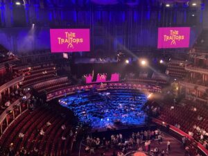 The prom was presented by Claudia Winkleman, the host of the TV show. The Traitors theme ran throughout the afternoon with ex-traitors emerging from the choir and orchestra, Claudia wafting around in a dark cloak, video clips from the programme and performers mingling with the arena audience. It definitely wasn’t your average prom!